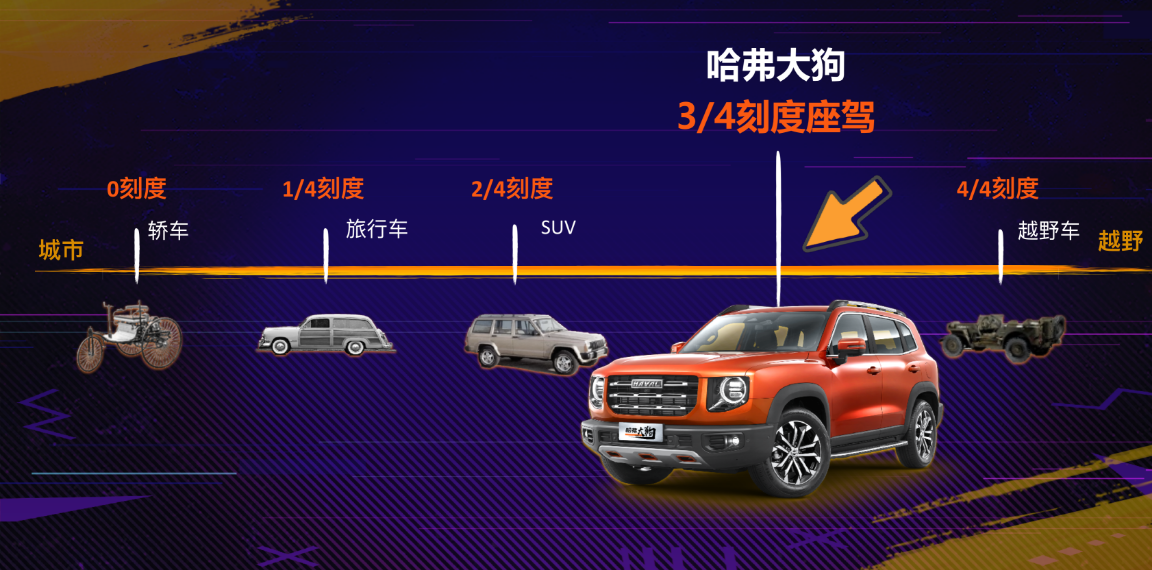 如果轿车在标尺上为0刻度,硬派越野车为4/4刻度的话,那么在0刻度和4刻度之间,1/4刻度的旅行车、2/4刻度的城市SUV,皆舒适有余“野性”不足。越来越多的年轻人希望“鱼和熊掌兼得”,既希望获得舒适的乘坐体验,又希望拥有潮野出行的性能。哈弗对此深刻洞察并率先入场,在已经红海的SUV市场创出全新3/4刻度座驾品类。它既有SUV的实用性,承载式的车身结构、领先的智能配置、精致的整车质感为用户营造了舒适的乘坐体验;又有致敬越野SUV的重要特点与个性,譬如硬朗野性的外观设计,出色的动力和通过性,以及高配车型的强悍越野配置等等,也满足了用户的审美需求和驾驶感受。